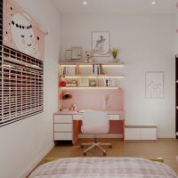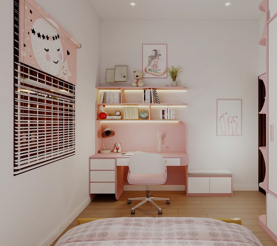 Bàn học nổi bật với tông màu hồng pastel chủ đạo kết hợp hài hòa với màu trắng tinh khôi, tạo nên một không gian học tập ấm áp và dễ thương.