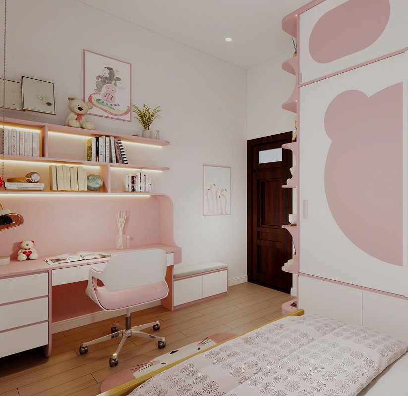 Đây là một thiết kế bàn học sinh tích hợp, hiện đại, tối ưu hóa không gian, đặc biệt phù hợp cho các bé gái yêu thích sự ngọt ngào, nhẹ nhàng. Sản phẩm không chỉ là nơi học tập mà còn là góc trang trí lý tưởng, khơi gợi niềm đam mê và sự sáng tạo.