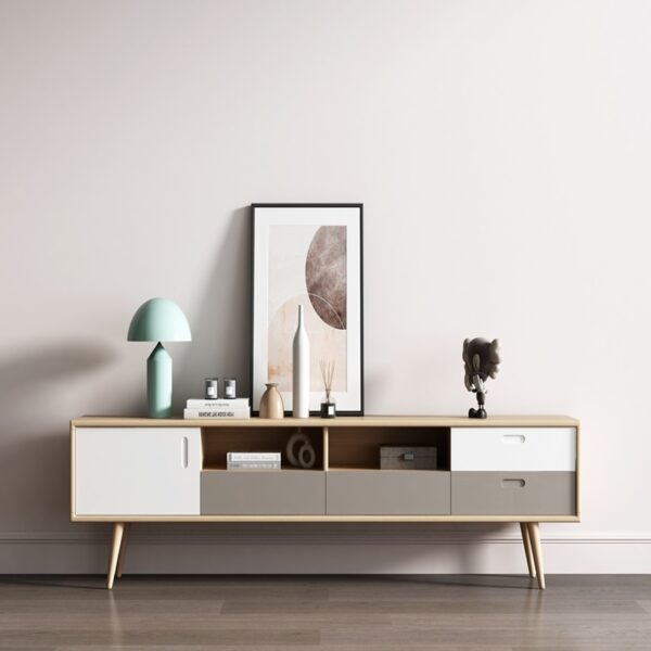 Kệ Tivi được thiết kế tối giản, tinh tế với chất liệu gỗ công nghiệp phủ melamine cao cấp, kết hợp gam màu trung tính (trắng – be – xám nhạt) mang lại cảm giác nhẹ nhàng, thanh lịch. Sản phẩm có 4 ngăn kéo và 2 khoang trống tiện lợi cho việc sắp xếp đồ trang trí, thiết bị điện tử hoặc sách báo.