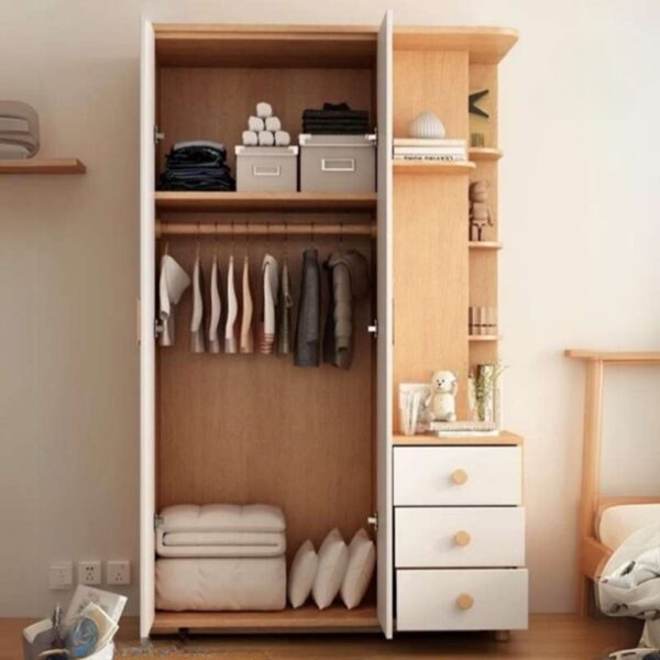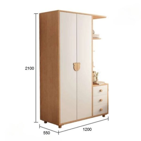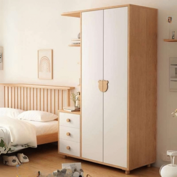 Tủ áo trẻ em thiết kế theo phong cách Scandinavian hiện đại, kết hợp tinh tế giữa hai tông màu trắng và gỗ tự nhiên, tạo cảm giác nhẹ nhàng, thân thiện và phù hợp với không gian phòng ngủ của bé. Tủ gồm hai cửa chính với tay nắm hình gấu đáng yêu, cùng hệ kệ mở và ngăn kéo tiện dụng bên hông, giúp bé dễ dàng sắp xếp quần áo và đồ dùng cá nhân. Các góc cạnh được bo tròn an toàn, chất liệu bền bỉ, thân thiện với môi trường, mang lại sự an tâm cho phụ huynh.