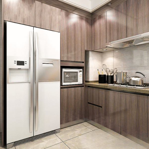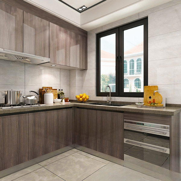 Tủ bếp gỗ công nghiệp thiết kế theo dáng chữ U hiện đại, mang phong cách tối giản nhưng sang trọng. Gam màu nâu gỗ tự nhiên kết hợp mặt đá bếp xám trung tính tạo nên không gian bếp tinh tế, sạch sẽ và ấm cúng. Bề mặt tủ được hoàn thiện mịn, chống bám bẩn, dễ vệ sinh – phù hợp cho các căn hộ, nhà phố hoặc biệt thự hiện đại.
