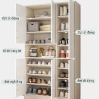 Tủ được chia thành nhiều ngăn tiện lợi, giúp phân loại giày dép, phụ kiện hoặc vật dụng nhỏ gọn gàng. Khoang trưng bày mở ở giữa có thể dùng để đặt lọ hoa, túi xách, chìa khóa hoặc đồ decor, tạo điểm nhấn thẩm mỹ cho không gian.