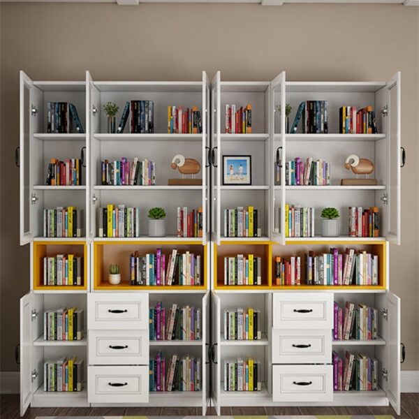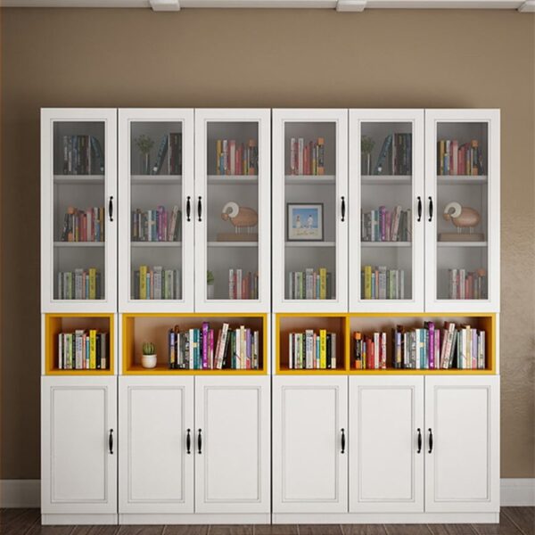 Tủ hồ sơ được thiết kế theo phong cách hiện đại, tinh tế với tông màu trắng chủ đạo kết hợp điểm nhấn vàng tươi ở khoang giữa, mang lại cảm giác trẻ trung và sinh động cho không gian làm việc. Phần tủ trên có cánh kính trong suốt giúp dễ dàng quan sát tài liệu hoặc trưng bày vật dụng trang trí, trong khi tủ dưới được chia ngăn khoa học với các hộc kéo tiện lợi cho việc lưu trữ hồ sơ, đồ dùng cá nhân.