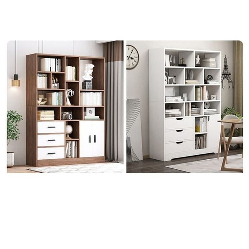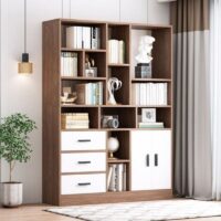 Tủ sách được thiết kế theo phong cách hiện đại, tinh tế với sự kết hợp hài hòa giữa màu óc chó sang trọng và trắng tinh khôi, mang đến vẻ đẹp trang nhã, dễ dàng phối hợp với nhiều không gian nội thất khác nhau. Bố cục tủ gồm nhiều ô kệ mở với kích thước đa dạng, tạo cảm giác sinh động và thuận tiện trong việc sắp xếp sách, đồ trang trí hay vật dụng cá nhân.
