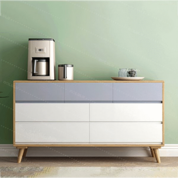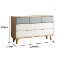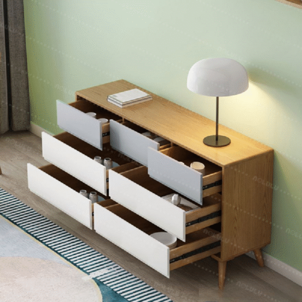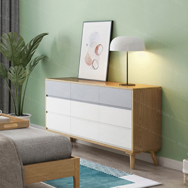 Tủ trang trí mang phong cách Bắc Âu hiện đại với thiết kế tối giản, tinh tế và sang trọng. Sự kết hợp giữa gam màu gỗ sồi sáng cùng các ngăn kéo màu xám nhạt và trắng tạo nên cảm giác hài hòa, nhẹ nhàng và thanh lịch cho không gian sống. Các đường nét vuông vức, chân tủ vát gọn tạo nên tổng thể thanh thoát, phù hợp với nhiều phong cách nội thất từ hiện đại, tối giản đến Scandinavian.