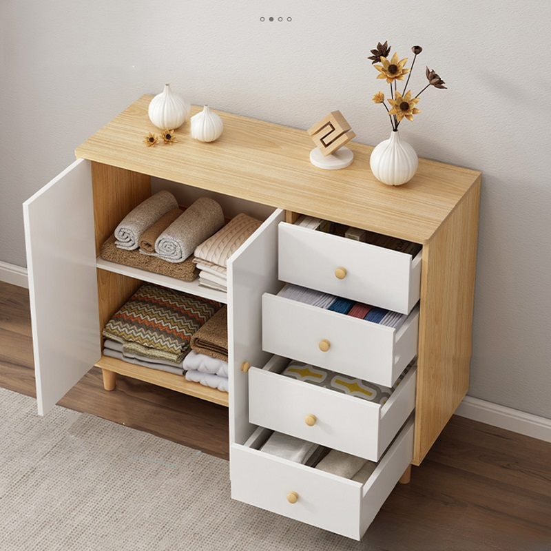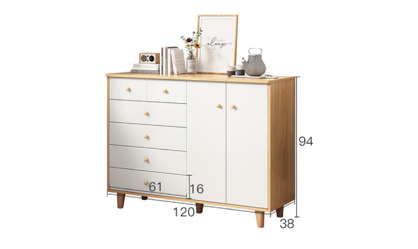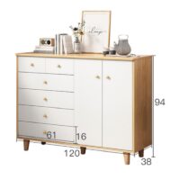 Tủ trang trí mang phong cách Bắc Âu hiện đại, kết hợp giữa sắc trắng tinh tế và vân gỗ sồi tự nhiên, mang lại cảm giác ấm áp và thanh lịch cho không gian sống. Thiết kế gồm hai cánh tủ lớn và năm ngăn kéo nhỏ giúp phân chia không gian lưu trữ khoa học, dễ dàng sắp xếp đồ dùng cá nhân, vật dụng trang trí hoặc tài liệu. Chân tủ cao thoáng, giúp việc vệ sinh sàn dễ dàng và tạo cảm giác nhẹ nhàng, thanh thoát cho tổng thể.