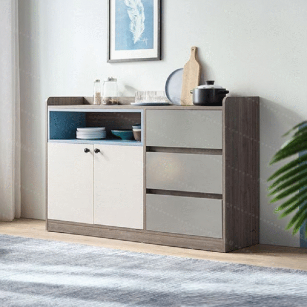 Thiết kế gồm 3 ngăn kéo lớn, 1 ngăn tủ đôi cánh mở và hộc trưng bày mở tiện dụng, mang lại khả năng lưu trữ linh hoạt cho nhiều loại vật dụng khác nhau như đồ trang trí, chén bát, ly tách, sách hay phụ kiện decor.