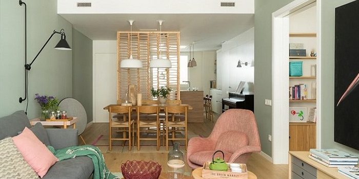 Không gian phòng khách được bố trí liền kề với khu vực bàn ăn và khu bếp của gia đình. Gian phòng có thiết kế khá đơn giản, gọn gàng với điểm nhấn là nội thất gỗ cùng chiếc ghế có màu sắc tươi sáng. Với việc lựa chọn nội thất đơn giản, không rườm rà mà KTS đã mang đến cho gia chủ nhiều diện tích sinh hoạt, khiến cho căn hộ có cảm giác rộng thoáng hơn nhiều.